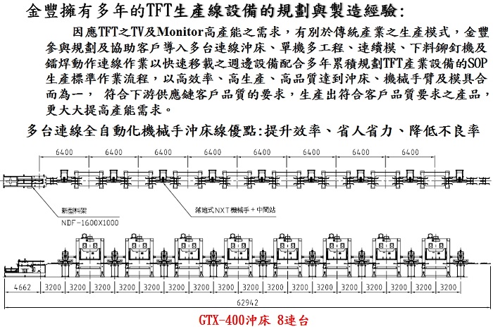 金豐於2001年參與國(guó)內(nèi)第一條TFT產(chǎn)業(yè)110 TON ×6連臺(tái)配合機(jī)械手臂生產(chǎn),為同業(yè)最先最早自動(dòng)化生產(chǎn)系統(tǒng)。